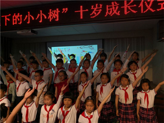 为帮助学生扣好人生第一粒扣子,体会十岁成长仪式的意义,明白十岁是人生从幼儿走向成人的重要一步,5月份学校举办了“阳光下成长的小小树”十岁成长仪式,全体三年级学生在老师的带领下踩着音乐节拍,在两棵“小小成长树”上按下自己彩色的小手印后,活动拉开了序幕。成长仪式共分为三个篇章,初生篇、感恩祝福篇和成长篇。此次活动让孩子们学会了感恩,感恩父母的养育之恩,感恩老师的教导之恩;让孩子们明白,长大了就要履行应尽的责任,努力拼搏,做一个社会有用之才。