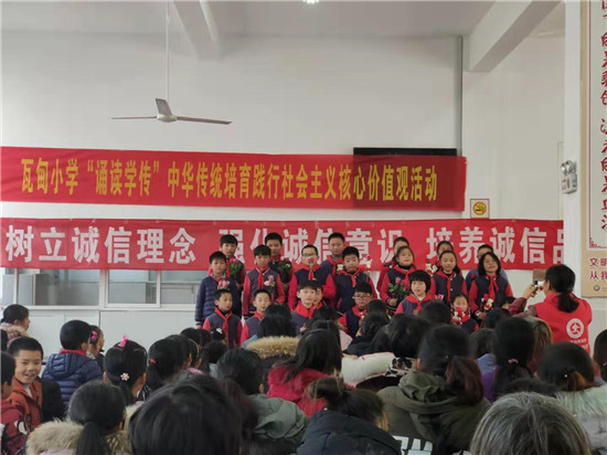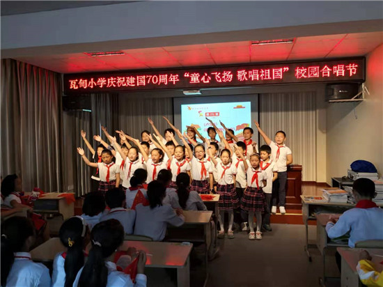 为庆祝中华人民共和国成立70周年,3月份,瓦甸小学举行了一场《歌唱祖国》的校园快闪活动,红旗飘飘,真情告白,全校师生将爱国情内化于心,外化于行。国庆节前夕,“童心飞扬 歌唱祖国”校园合唱节学生用歌声诠释对祖国的热爱。为了让社会主义核心价值观入脑入心,11月份,瓦甸小学开展“诵读学传”、“诚信宣传月”活动,诵读名家经典,弘扬诚信美德。12月份宪法宣传周,崇尚宪法、学习宪法、遵守宪法、维护宪法、运用宪法,努力让爱国情驻足在学生心田。
