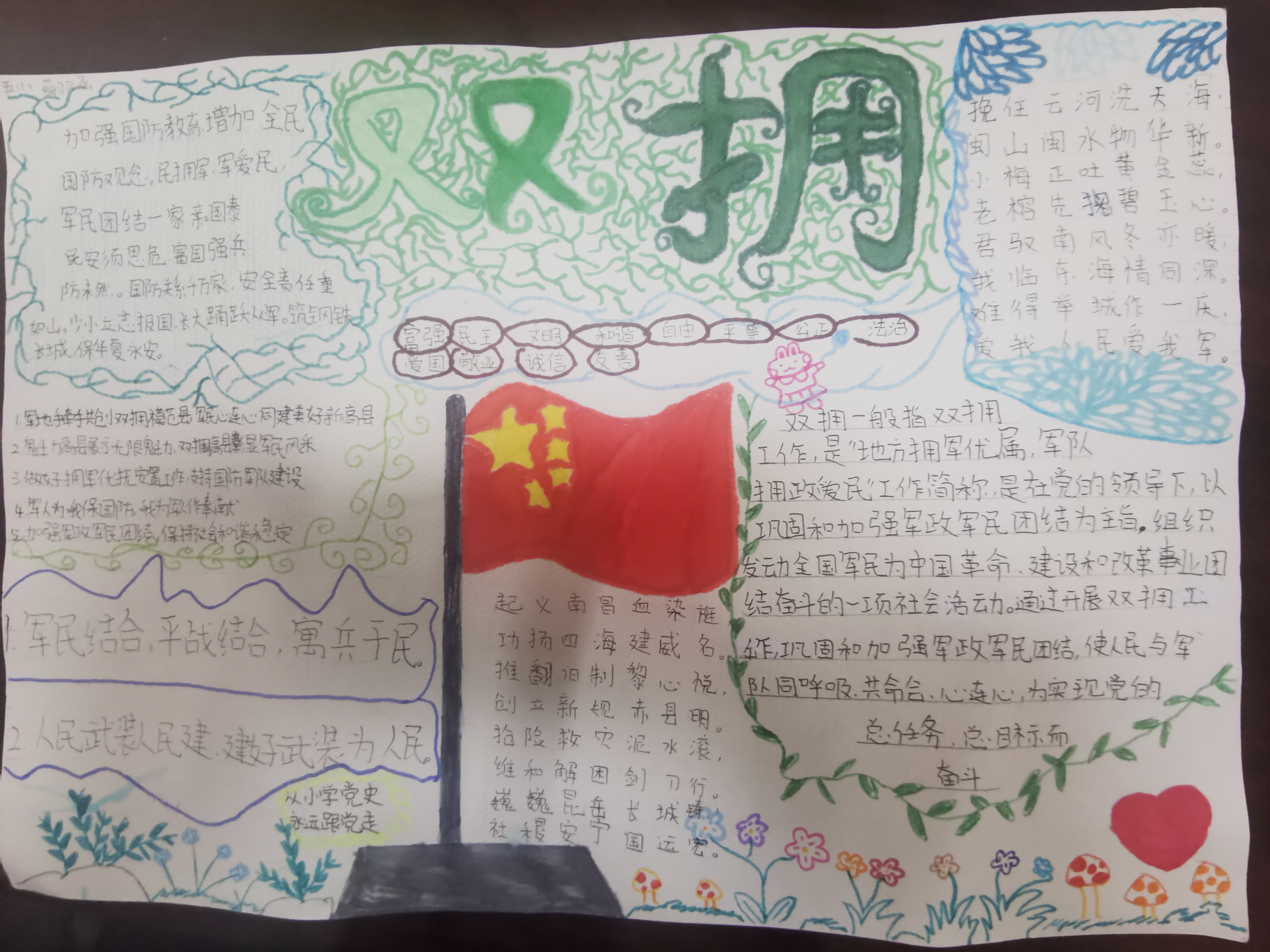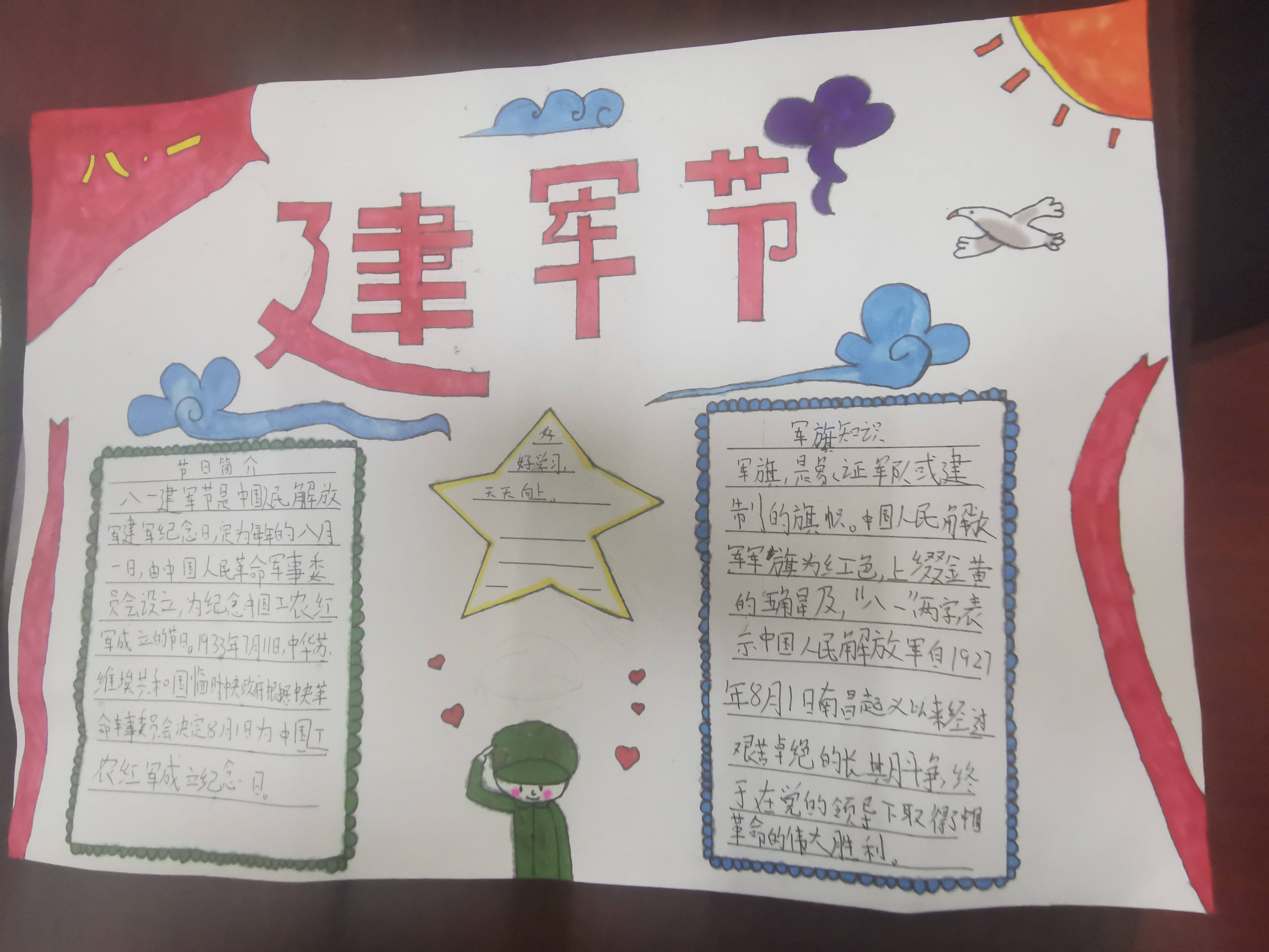 学习国防知识。班主任指导学生收看cctv-7国防军事频道,引导学生自觉养成关心国防军事、学习并主动收集当前相关国防信息的习惯,了解中国人民解放军军旗、军徽知识,利用收集的资料,人人做一份主题鲜明、内容充实、富有创意的绘画或手抄报。